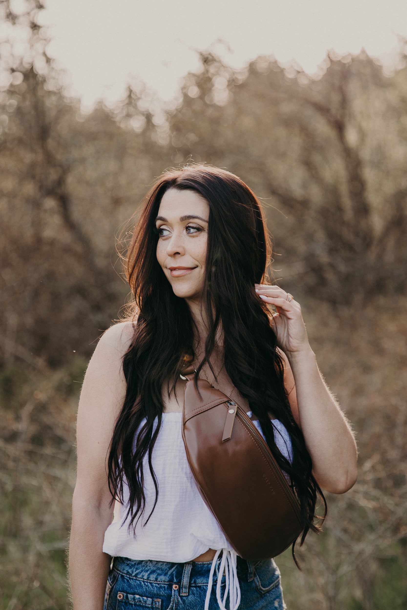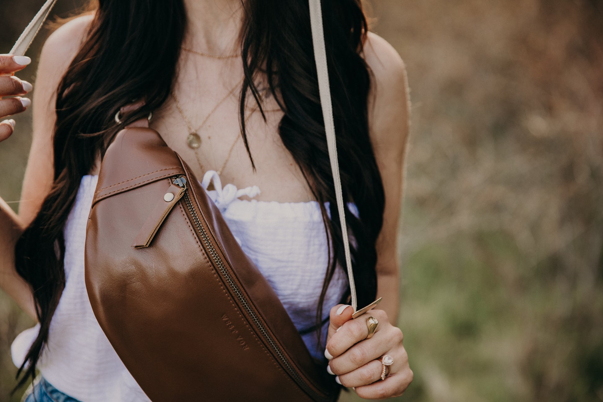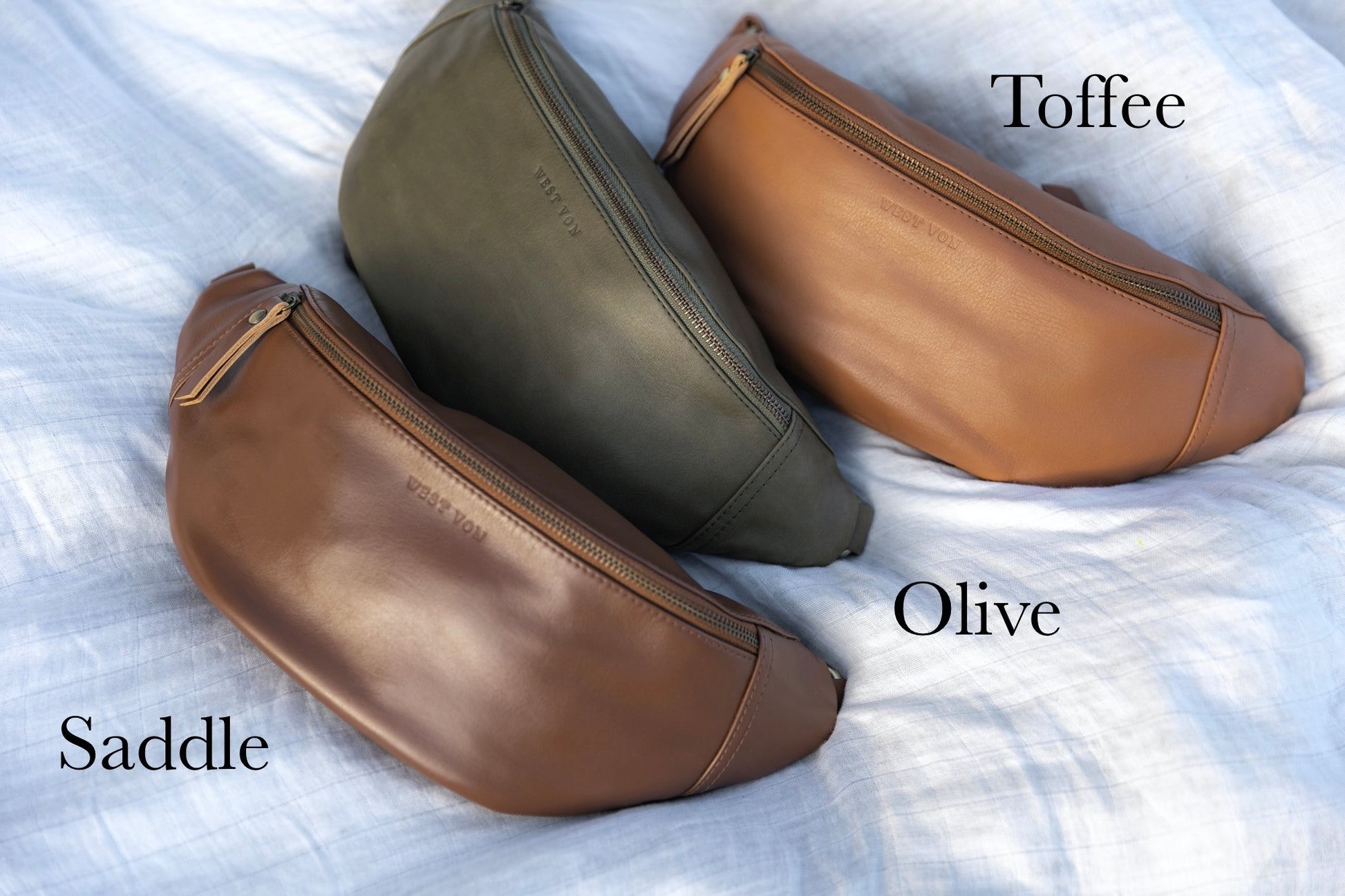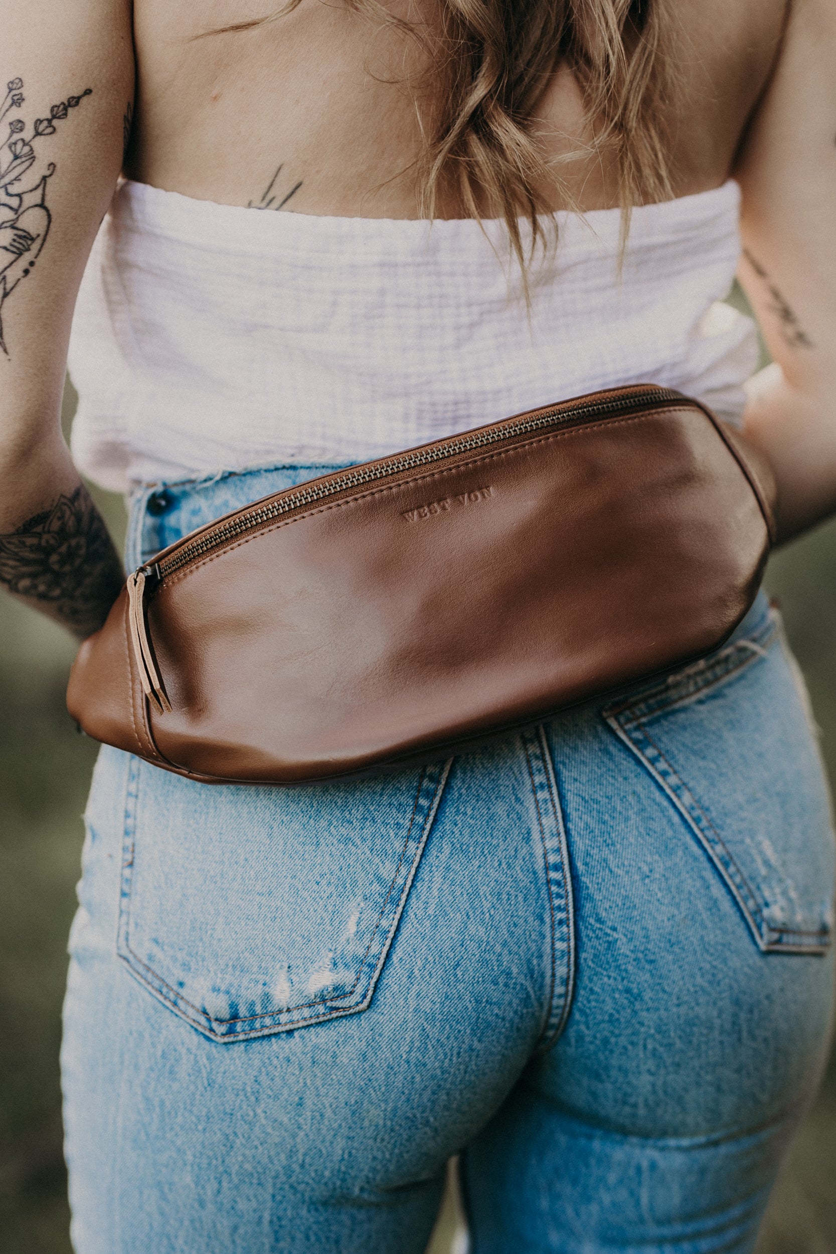 Indie is here! You've been asking for a larger leather sling and it’s finally here! Crafted in small batches in Bali Indonesia, this stunning new design holds more than our Ella Sling. Genuine leather, sleek and minimalistic. Quite possibly the most stylish Fanny Pack ever! The main belt features a brass buckle release for easy on and off. Belt can be adjusted for wearing around the hip, across the body and over the shoulder. Also available in Noir, Toffee, Olive and Dark Brown.