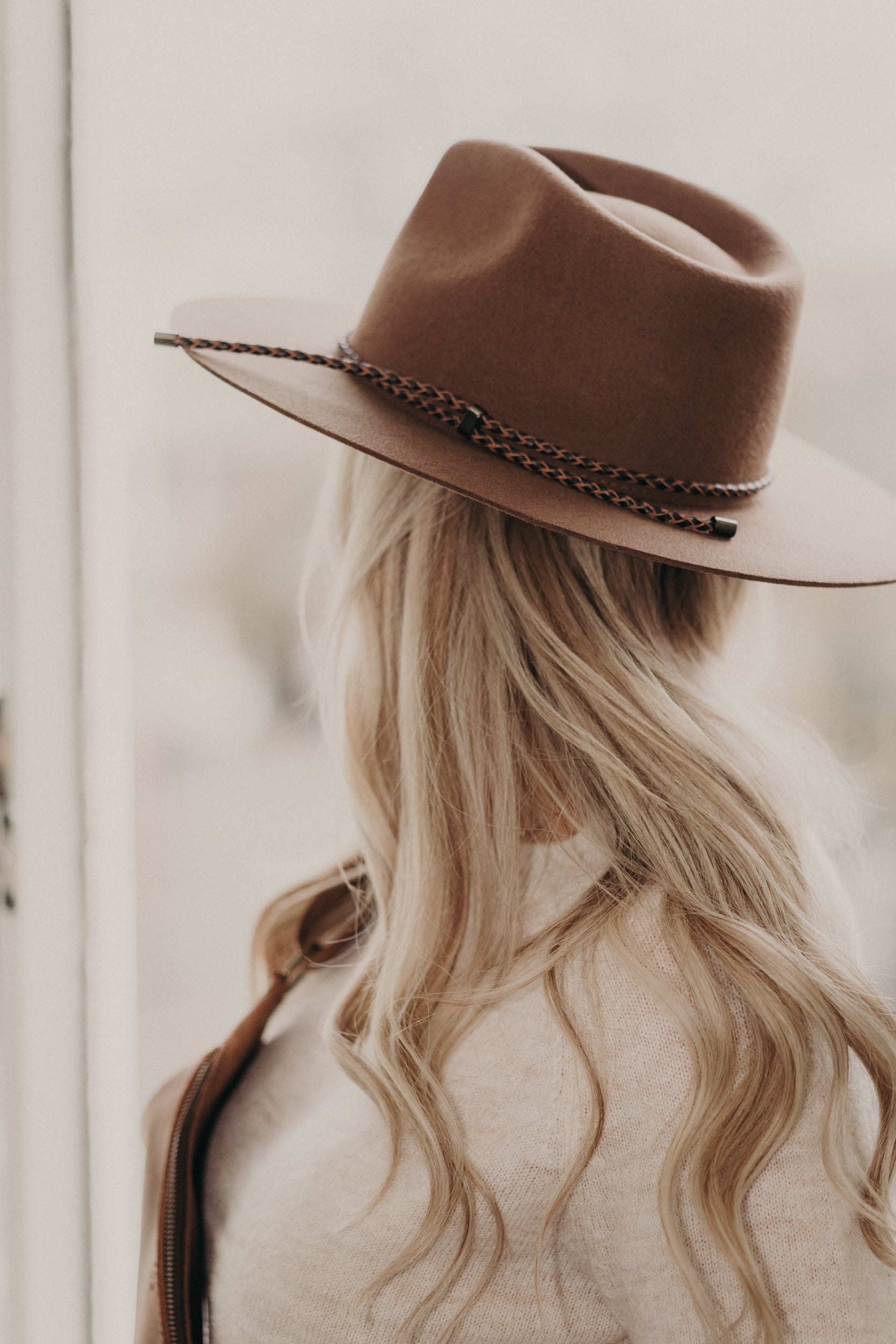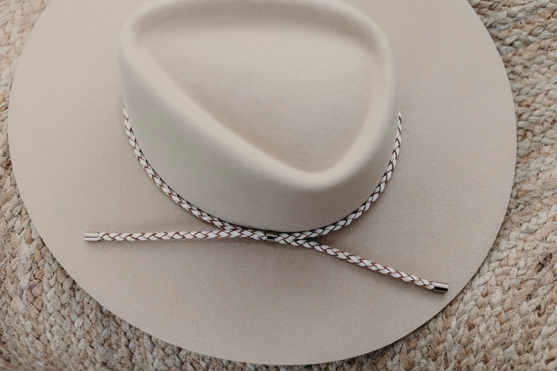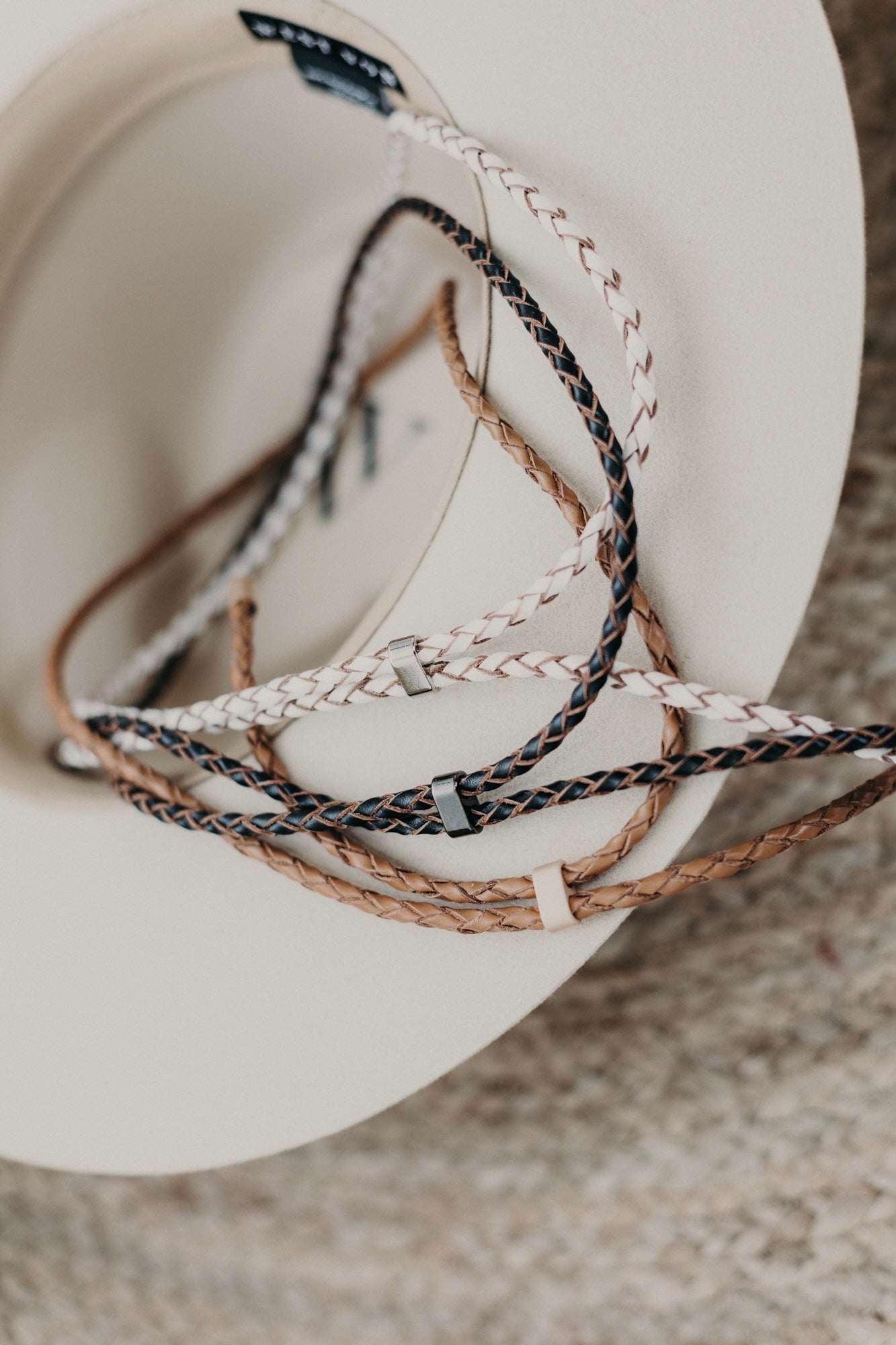 Switch up the look of your hat with a beautiful adjustable braided hat band. Wear it to the side or back. Perfect addition to any wide brim hat! Completely adjustable and available in three colours.