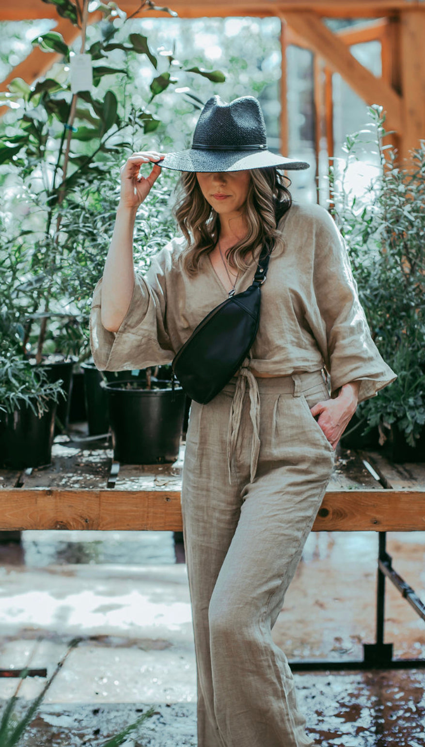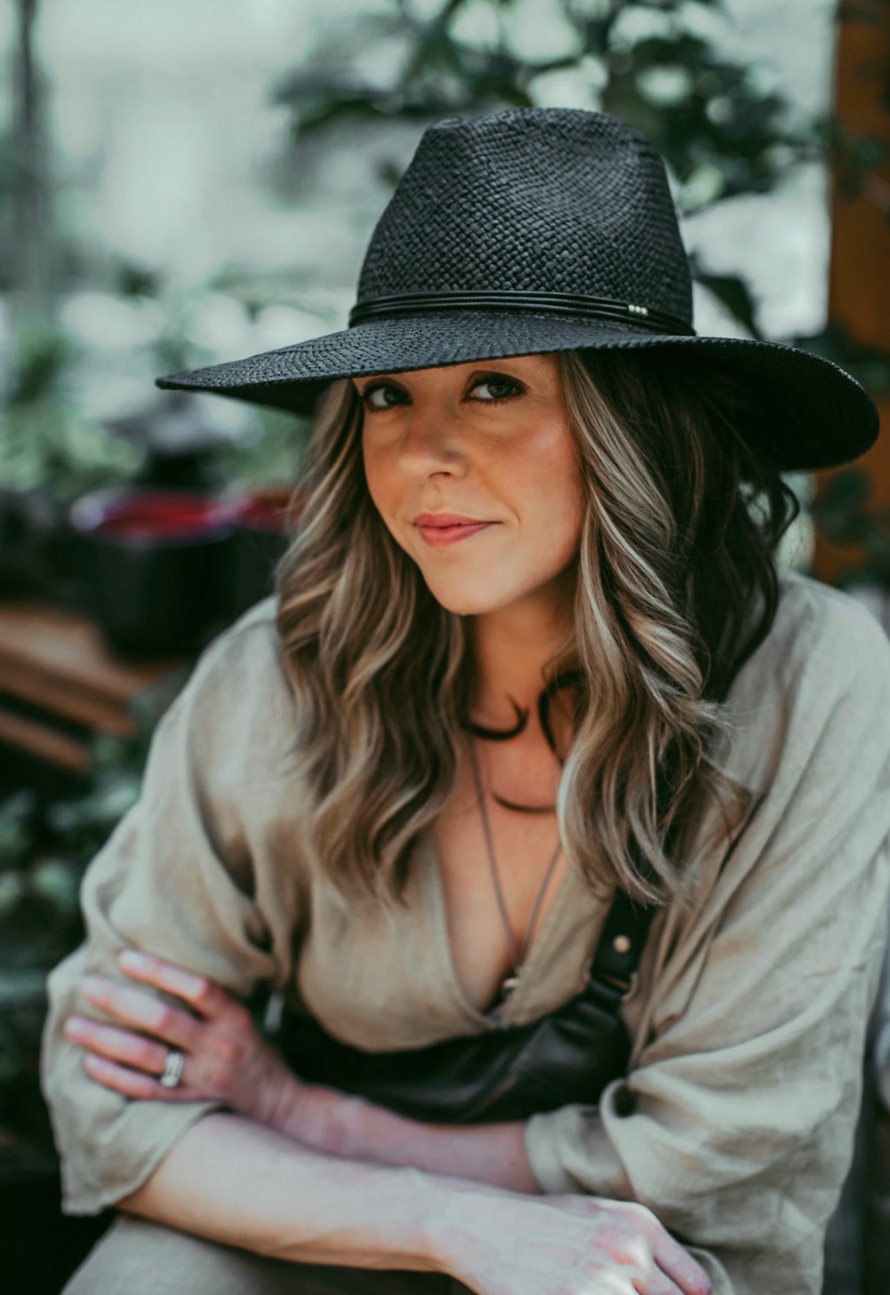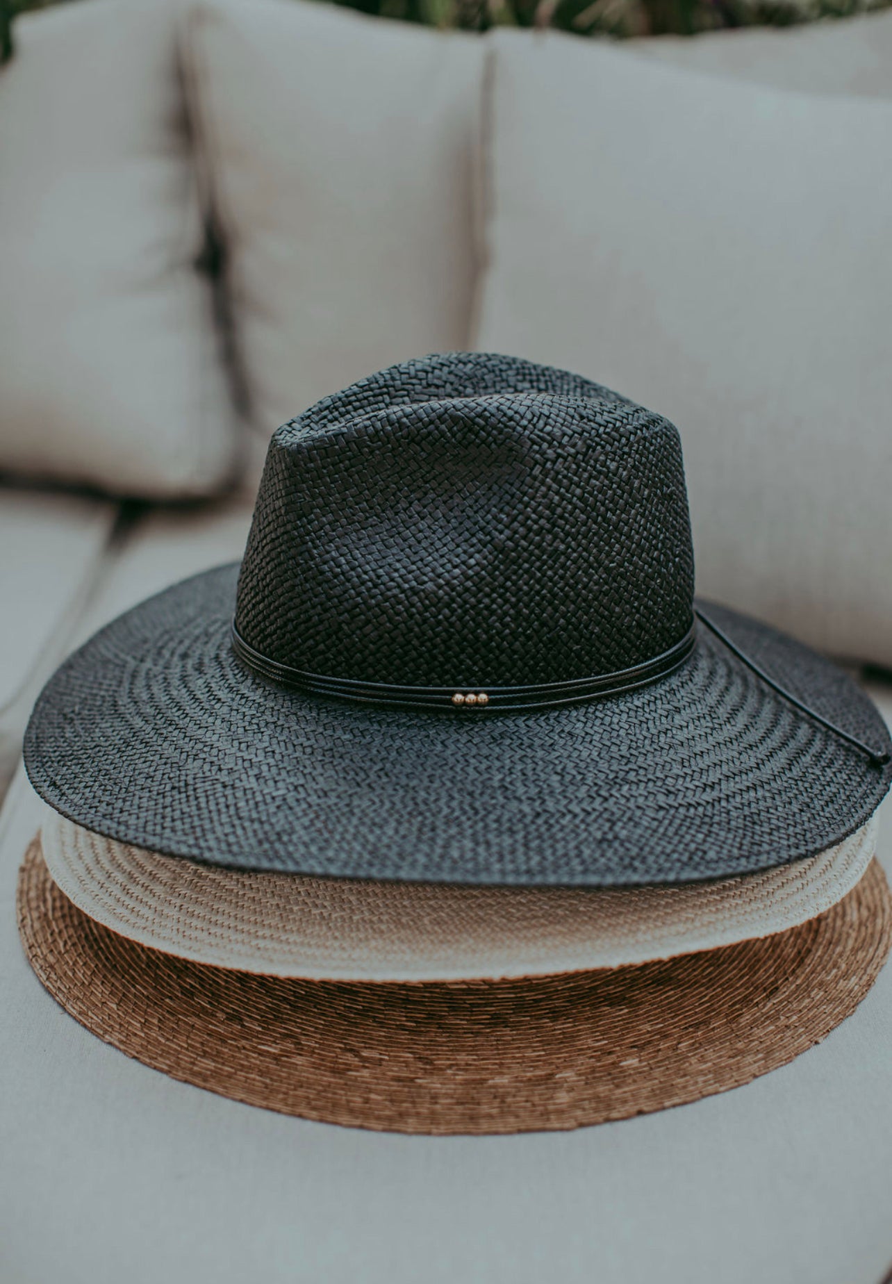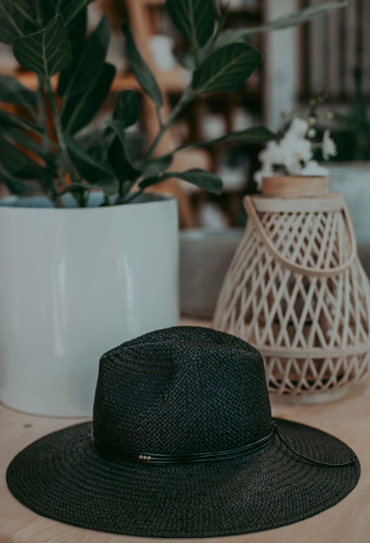 Luna is a beautiful wide A-line brim fedora in jet black, Noir. 100% structured paper straw, finished with a removable triple waxed cord band and gold beads. She’s sleek, sexy and sophisticated. You may recognize her, as she’s a take on our popular Blake hat.