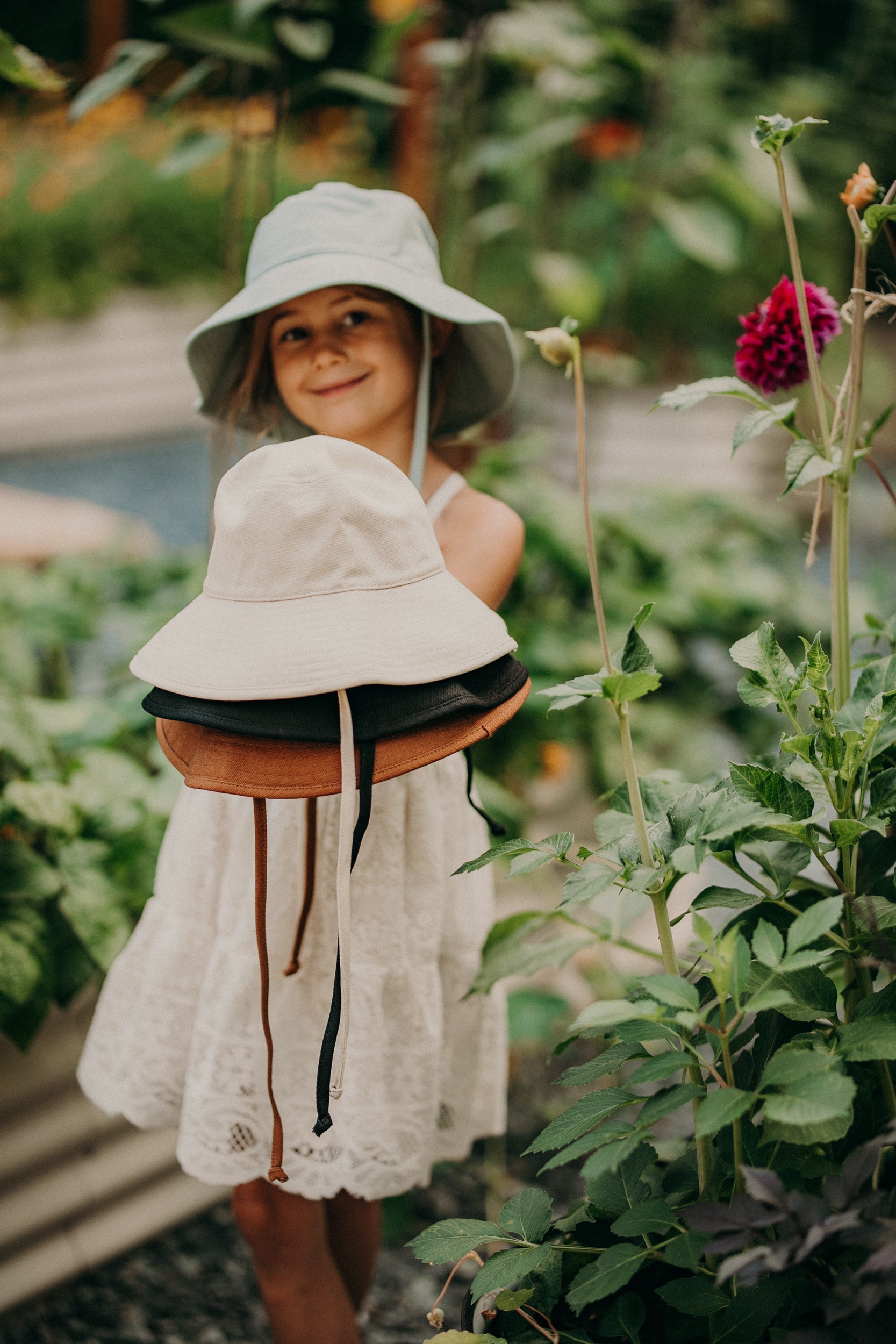 Willa is back and better than ever! Newly designed with a slightly shorter brim and crown than previous seasons, fully lined and a new cotton fabric. Available in 4 new stunning colours: jet, sky, cream and cinnamon. Willa features the most beautiful wide brim with stitching detail, that is the perfect amount of sun coverage. She also flips up {and stays up!} easily! She can also can be tied under the chin for windy days or days on the boat.